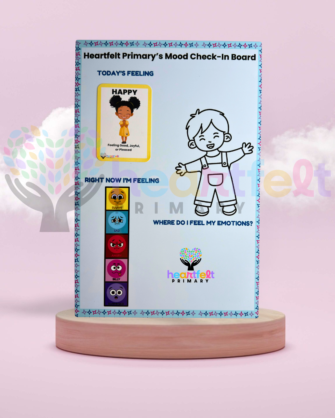 Mood board with mood strip, child figure and card holder